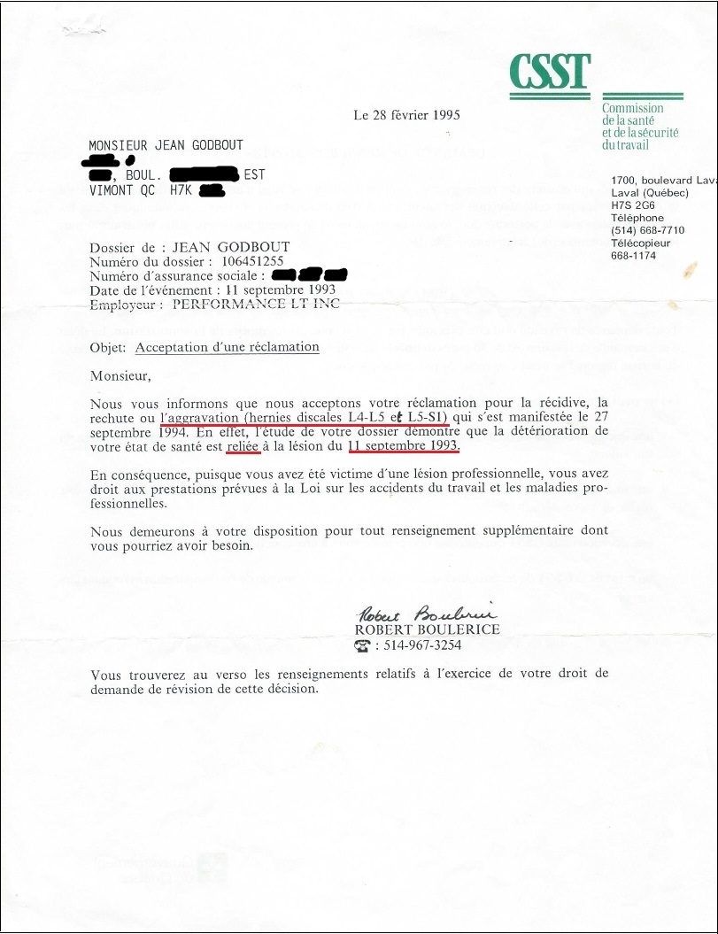 Voilà le crime commit par Robert BOULERICE de la CSST avec la complicité des