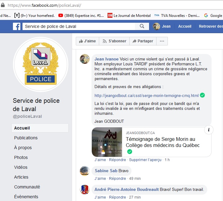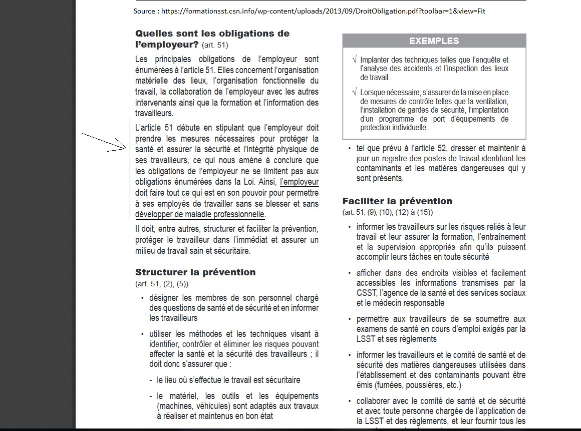 On constate que l'employeur a l'obligation de prendre les mesures nécessaire pour protéger la santé et assurer la sécurité et l'intégrité physique du travailleur, M. Serge MORIN admets qu'il constatait et voyait bien que je n'allais pas bien du tout, pourtant il admets aussi qu'il m'a fait travailler avec ces lourds poids ... (75, 100 et 125 livres qu'il détaille si bien .. il a vérifié avec les cartes de temps qui incluent les numéros des pièces, c'est comme ça que ça se passe dans le domaine de l'aéronautique, tout est controlé, enregistré, estampillé, approuvé ou rejeté par l'inspecteur etc...) et cela est une violation de la loi, un crime contre la personne, une négligence criminelle mais la justice, en ne voyant rien et donc en ne faisant pas de procès, sert et protège le crime organisé de l'État, de la CSST et du patronat (l'employeur), tout comme les complices criminels du Collège des médecins du Québec et de l'Office des professions du Québec qui ne voient pas de problème à détruire des vies.