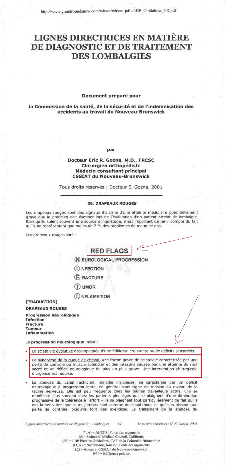 causaient une sciatalgie bilatérale (un drapeau rouge qui signale un DANGER